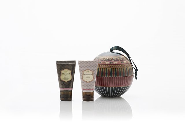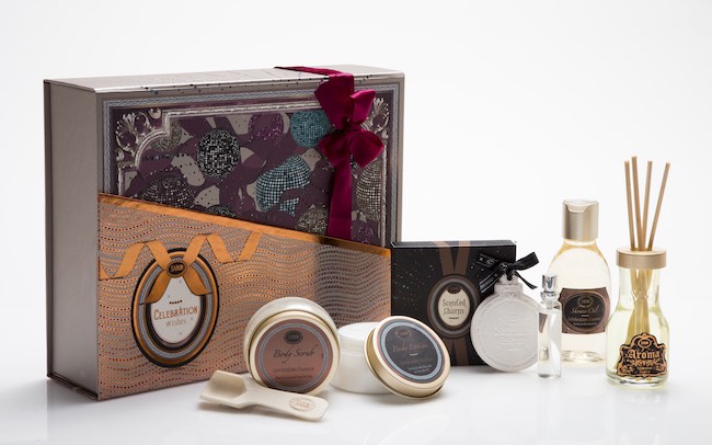 ボディスクラブ(スクープ付き)、シャワーオイル、ボディローション、バターハンドクリーム、バスボール、アロマリードディフューザーなどが入っています。